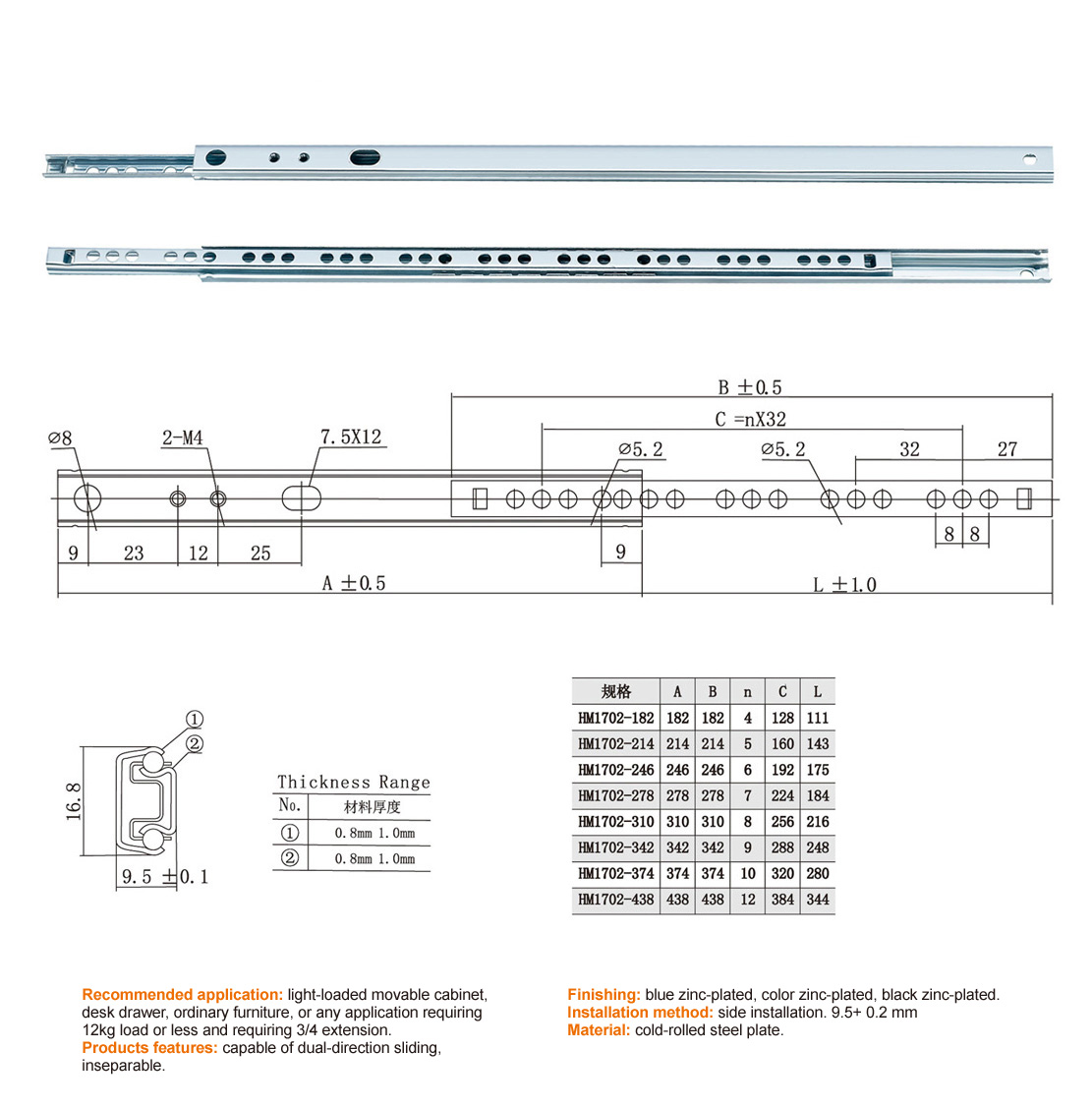 HM1702 17/27 2-FOLD BALL BEARING SLIDE